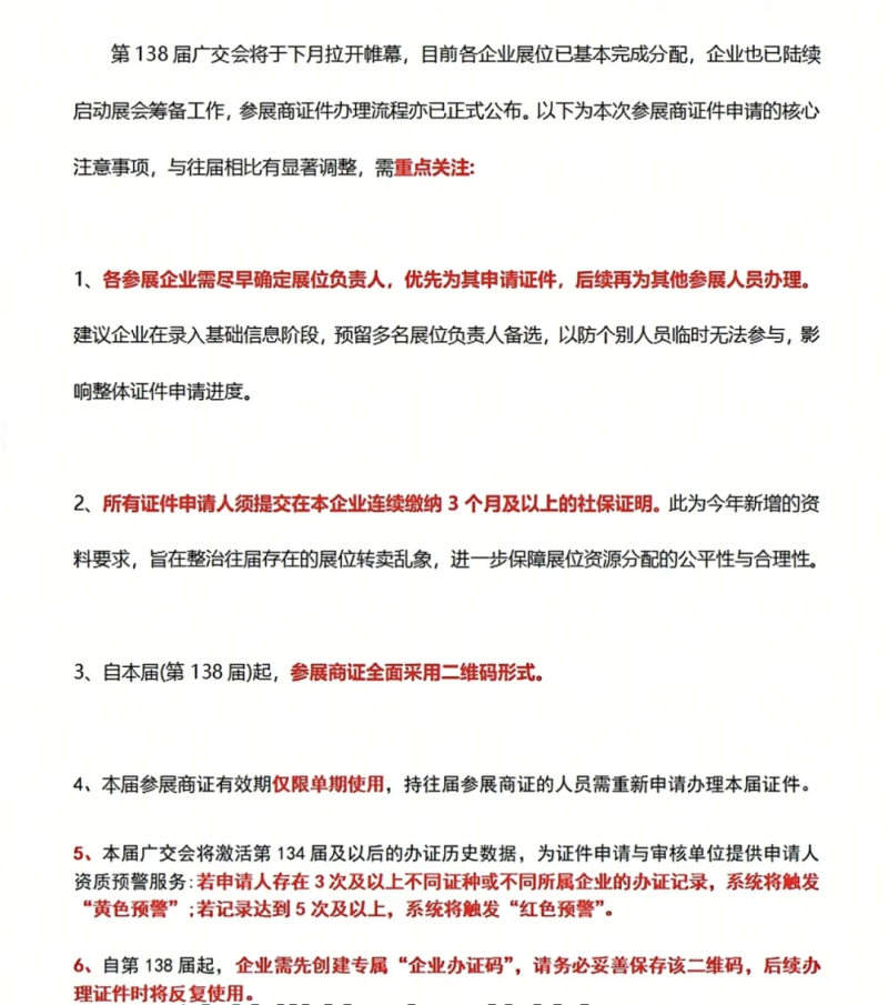 第二道坎是买家办证的 “连环麻烦” 。境外客户想进场,得先在系统预注册,还得提供 2025年3月1日后的入境记录;往年能用的长期采购商证,今年缩短到仅 6 届有效,且不能绑定中方陪同人员。