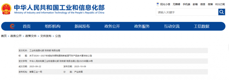 根据《关于延续和优化新能源汽车车辆购置税减免政策的公告》(财政部税务总局工业和信息化部公告2023年第10号),结合新能源汽车技术进步、标准体系发展和车型变化情况,现就2026—2027年减免车辆购置税新能源汽车产品技术要求有关事项公告如下: