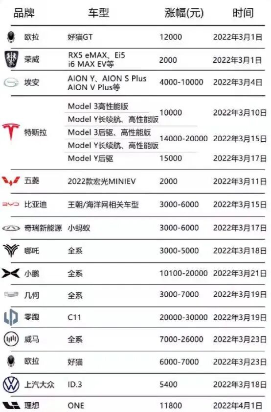 纵观汽车领域,大多数相关产品都开始提价。据一马传媒统计,3月以来,已经有20多家新能源车企宣布涨价,涉及车型40多款。