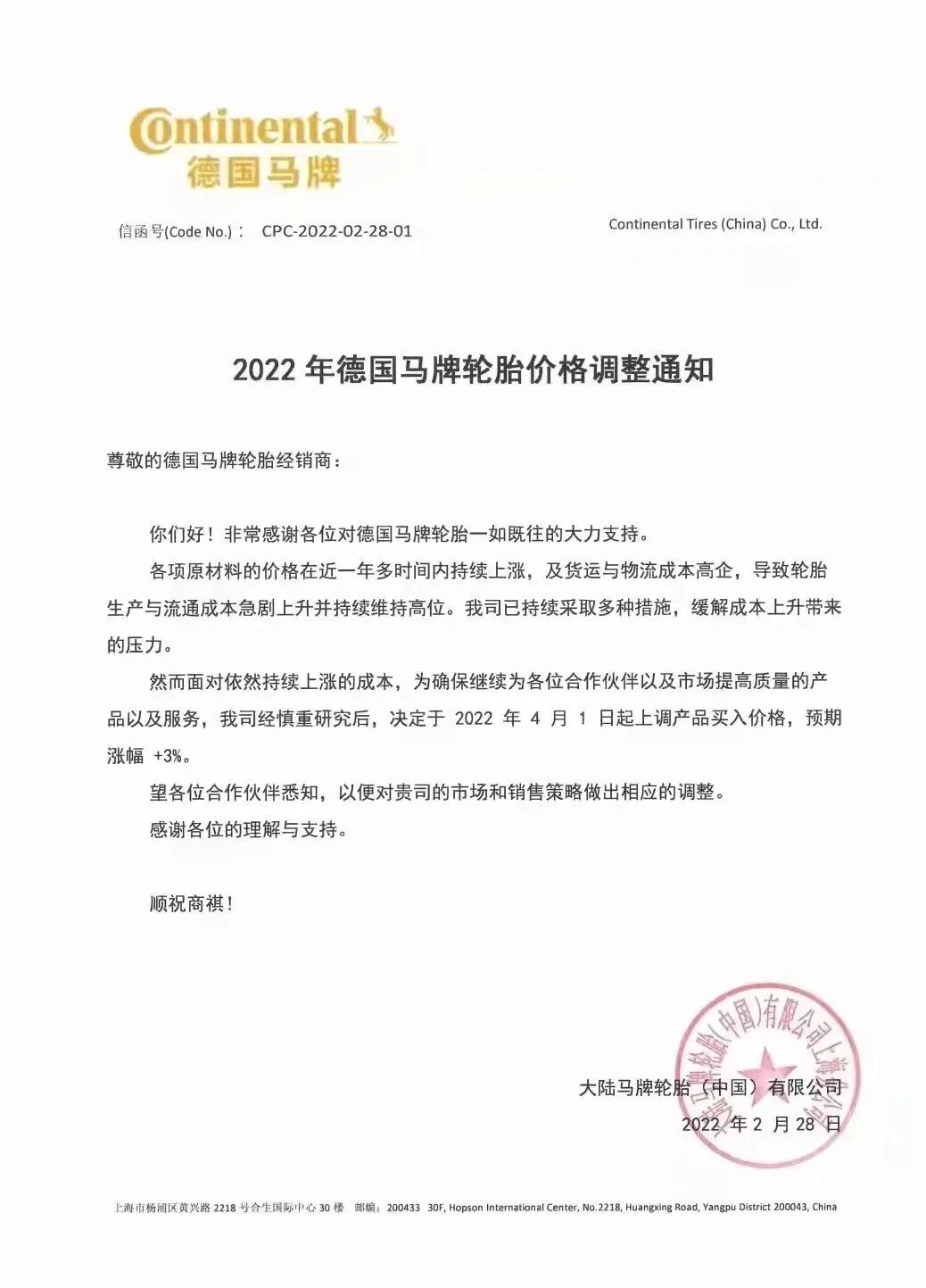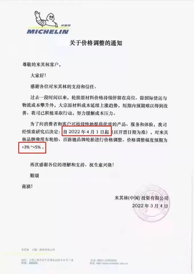 进入2022年,全球轮胎价格涨势难掩,涨价的轮胎企业涉及十多家。固特异自4月1日,整体总价平均上涨5%左右,米其林自4月1日,对米其林乘用轮胎价格上调3%-5%,玲珑自4月1日起,对国内市场PCR各品牌全系产品价格上调3%-5%。疫情反反复复,原材料不断涨价,发货运输困难导致轮胎行业面临极大的供应挑战,眼看着价格一浪高过一浪。